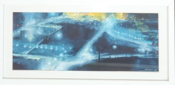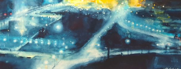 Taiteilijan sanat: Kuvasin kaupungin yömaisemaa, missä kirkkaat valot ja tumma pimeys kohtaavat ja missä erilaiset reitit kulkevat etäälle horisonttiin kohti sykkivää keskustaa.